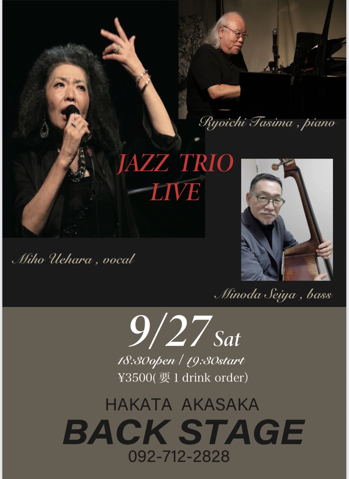 Open at 18:30 / Start at 19:30 / \3,500 + 1 drink order
